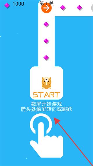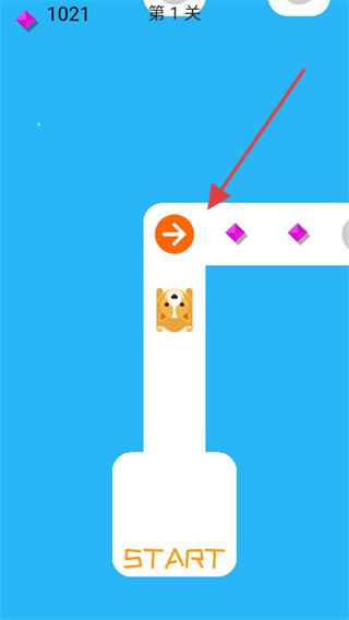 1、進入游戲看到START按鈕和提示,點擊屏幕開始游戲,萌寵會沿著路徑前進,途中能收集紫色菱形道具。