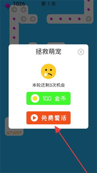4、若萌寵闖關(guān)失敗,會彈出拯救萌寵提示框,此時可選擇花費100金幣或點擊免費復(fù)活按鈕,讓萌寵重新開始闖關(guān)。
