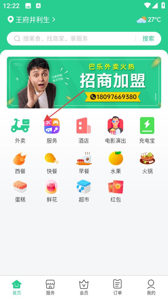 1、首頁(yè)展示巴樂(lè)外賣(mài)廣告,還有外賣(mài)、服務(wù)等多品類(lèi)圖標(biāo),底部是首頁(yè)、服務(wù)等導(dǎo)航欄。