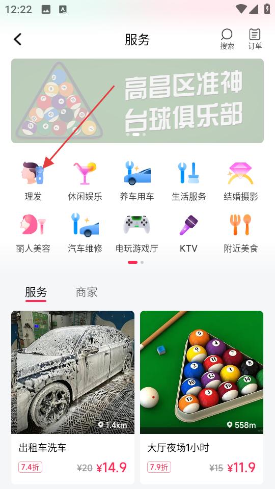 2、服務(wù)頁(yè)面,有臺(tái)球俱樂(lè)部廣告,涵蓋理發(fā)、休閑娛樂(lè)等服務(wù)分類(lèi),下方呈現(xiàn)出租車(chē)洗車(chē)、臺(tái)球夜場(chǎng)等服務(wù)及優(yōu)惠價(jià)格。
