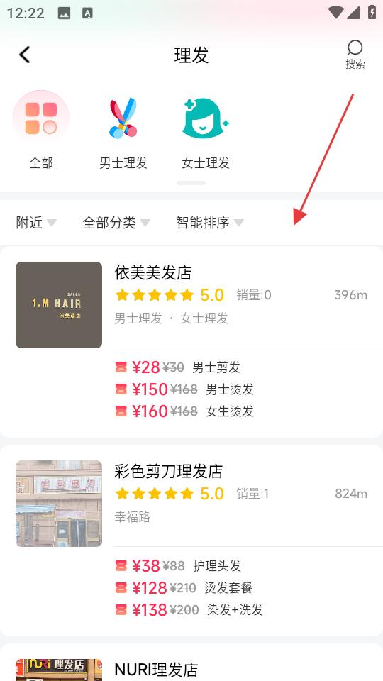 3、理發(fā)頁(yè)面,分全部、男士、女士理發(fā),有依美美發(fā)店等商家,顯示評(píng)分、距離及剪發(fā)、燙發(fā)等項(xiàng)目?jī)?yōu)惠價(jià)格。
