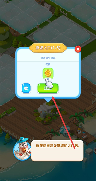 2、觸發(fā)影城入口建造任務(wù)點(diǎn)擊綠色建造按鈕消耗指定金幣完成建筑,此舉解鎖影城區(qū)域推進(jìn)主線為后續(xù)影廳配套設(shè)施擴(kuò)建鋪路。