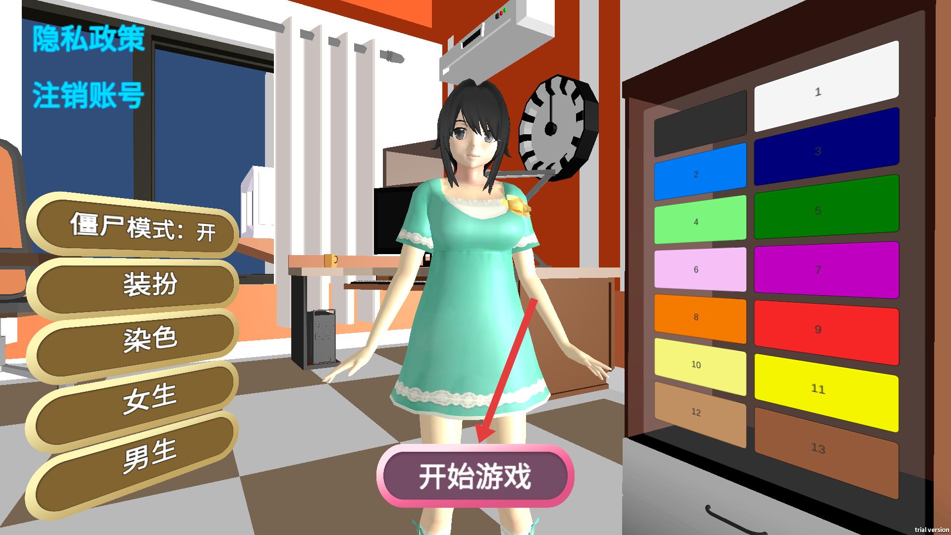1、進(jìn)入游戲前,可在界面選擇僵尸模式開關(guān),還能進(jìn)行裝扮、染色,以及選擇角色性別,設(shè)置好后點(diǎn)擊開始游戲即可進(jìn)入。