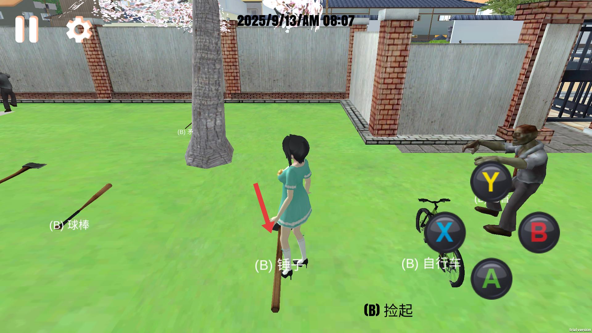 3、場景里有錘子、球棒等武器,靠近錘子時(shí),會(huì)出現(xiàn)撿起提示,點(diǎn)擊對應(yīng)按鍵就能撿起錘子,為后續(xù)對抗僵尸做準(zhǔn)備。
