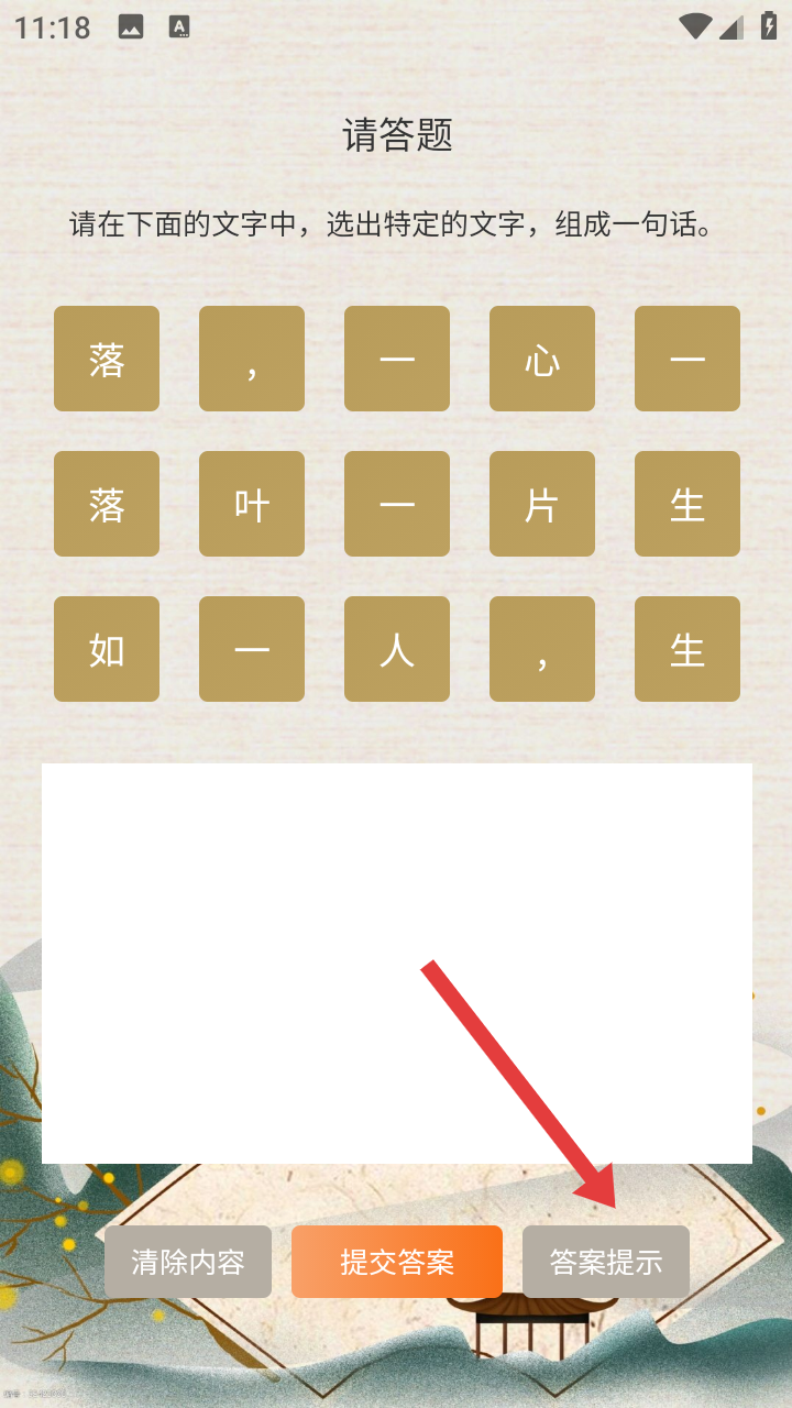 2、答題時(shí)需從給出的文字中選出特定文字組成一句話,若有困難,可點(diǎn)擊答案提示獲取幫助。