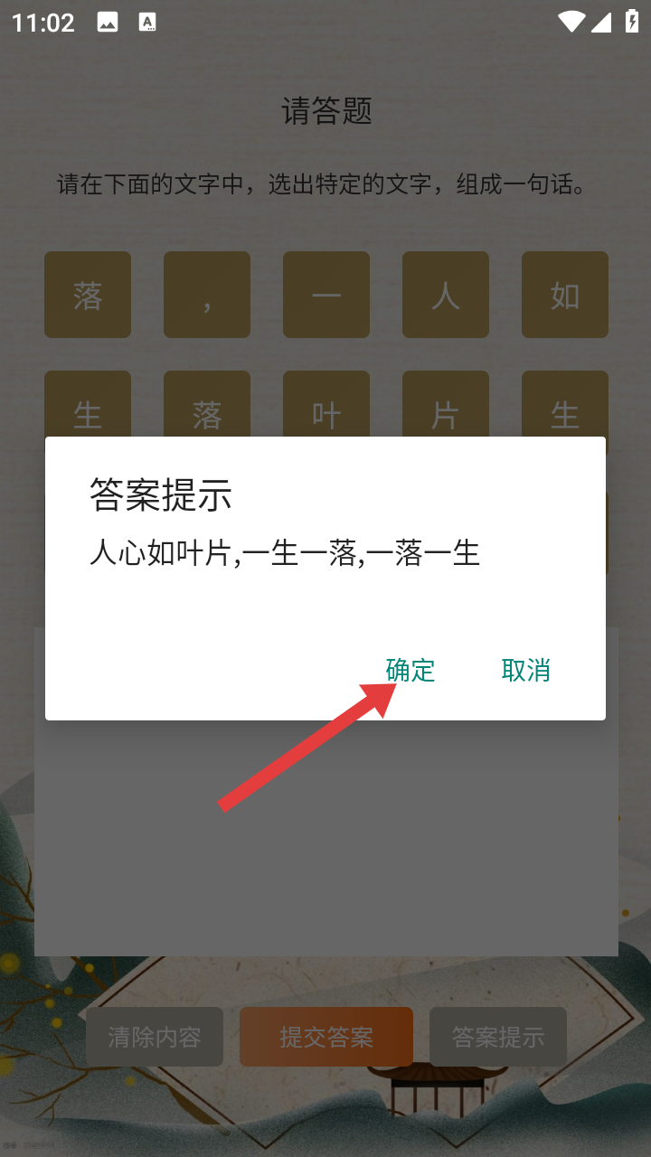 3、點(diǎn)擊答案提示后,會(huì)彈出提示框顯示答案,比如人心如葉片,一生一落,一落一生,看完后點(diǎn)擊確定。