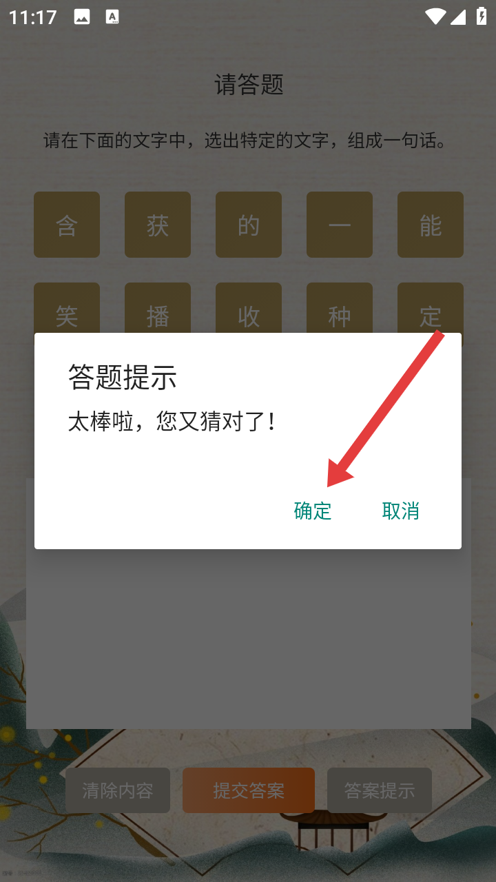 4、若答題正確,會(huì)彈出提示框顯示太棒啦,您又猜對了,點(diǎn)擊確定可繼續(xù)下一題挑戰(zhàn)。
