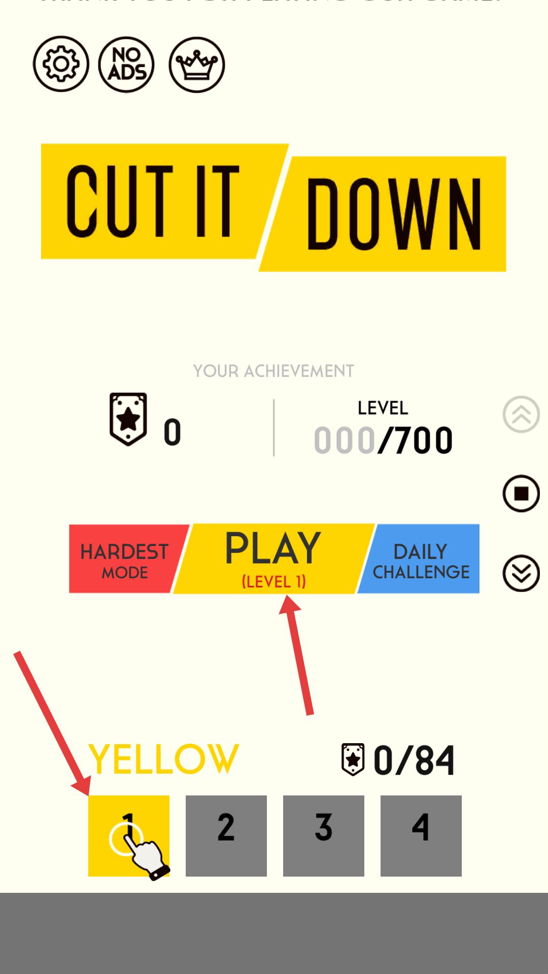 1、游戲主界面點擊的PLAY按鈕,選擇箭頭所指區(qū)域的第1關即可進入游戲第一關,開啟挑戰(zhàn)。
