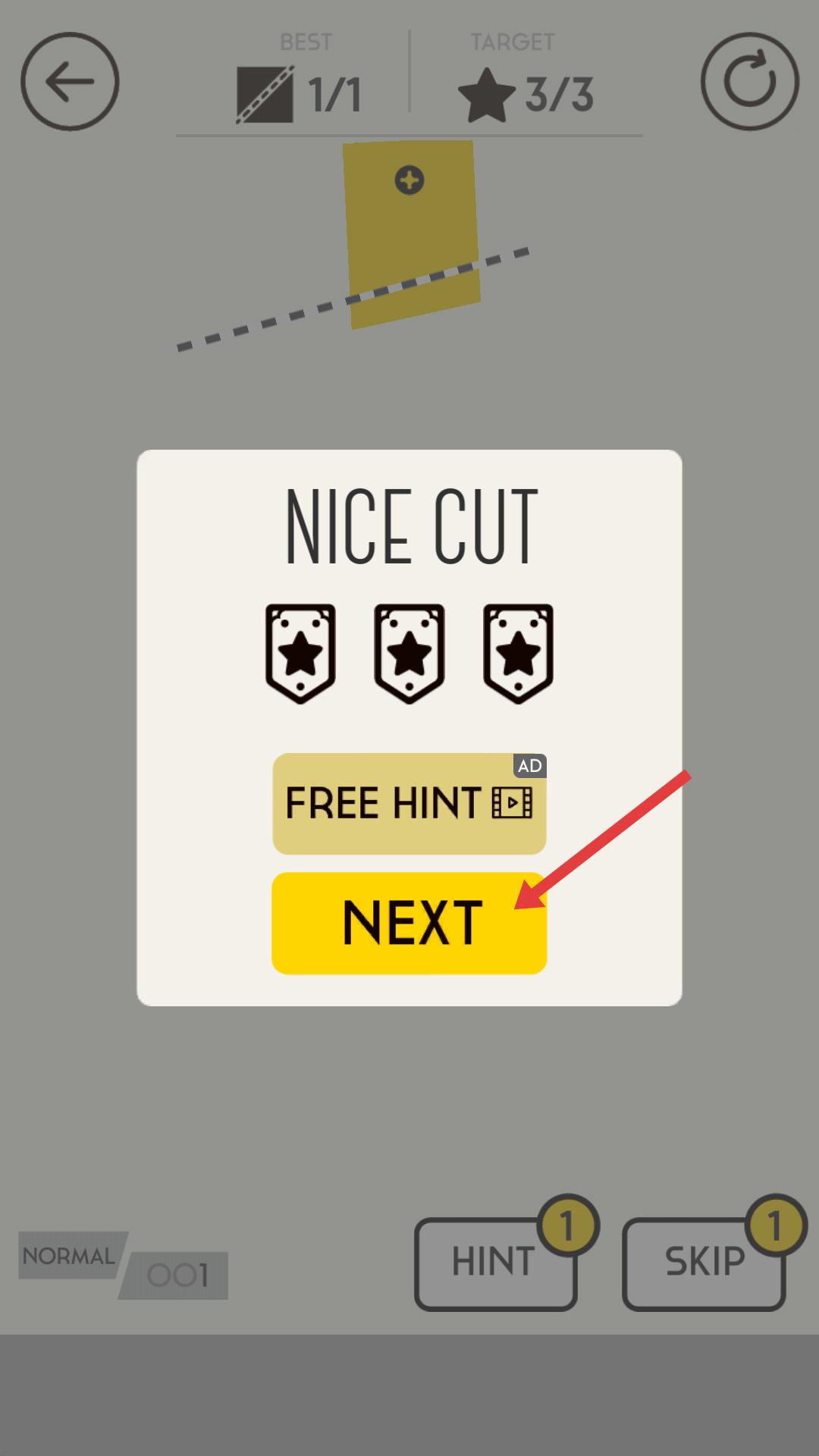4、成功收集所有星星并完成關卡后,界面會顯示獲得三顆星,點擊NEXT按鈕可進入下一關繼續(xù)挑戰(zhàn)。