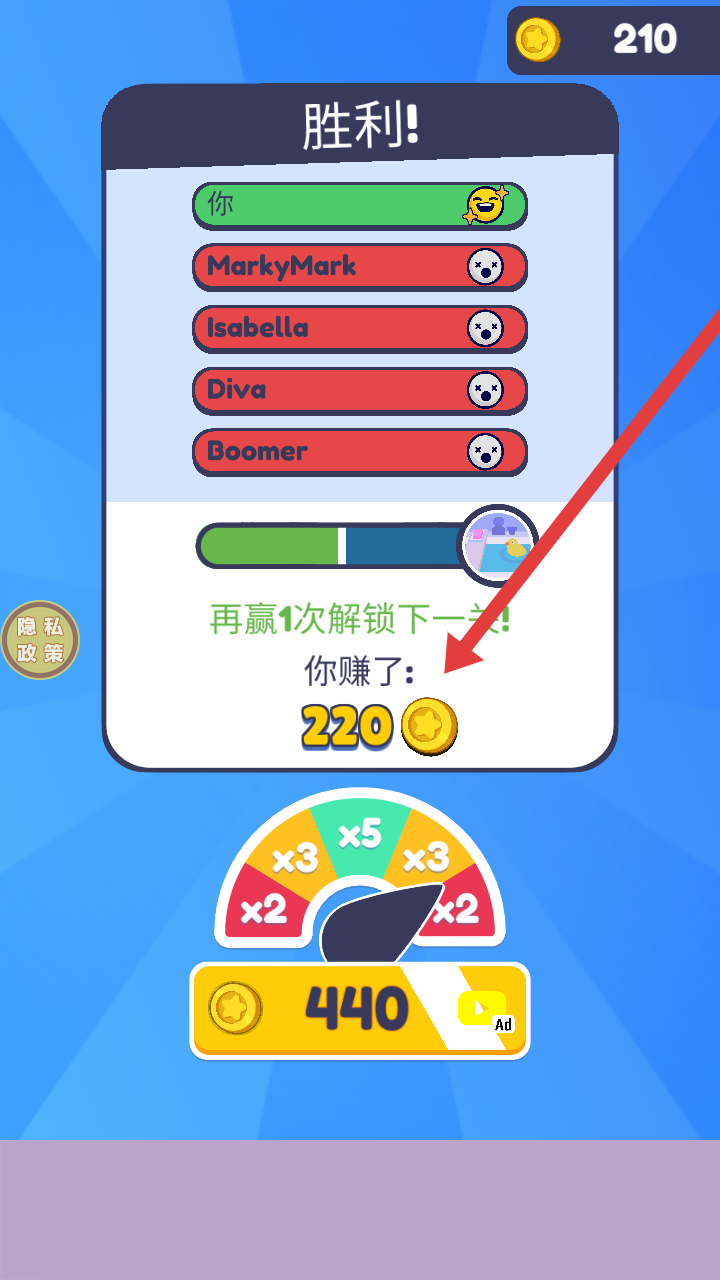4、成功隱藏并堅(jiān)持到最后,獲得勝利,能賺取220金幣,再贏1次還可解鎖下一關(guān),繼續(xù)新的躲貓貓冒險(xiǎn)。