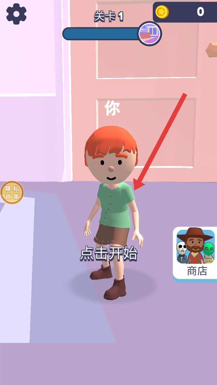 1、進(jìn)入游戲,處于關(guān)卡1點(diǎn)擊開始,開啟躲貓貓?zhí)魬?zhàn),需要快速找到合適的隱藏方式。