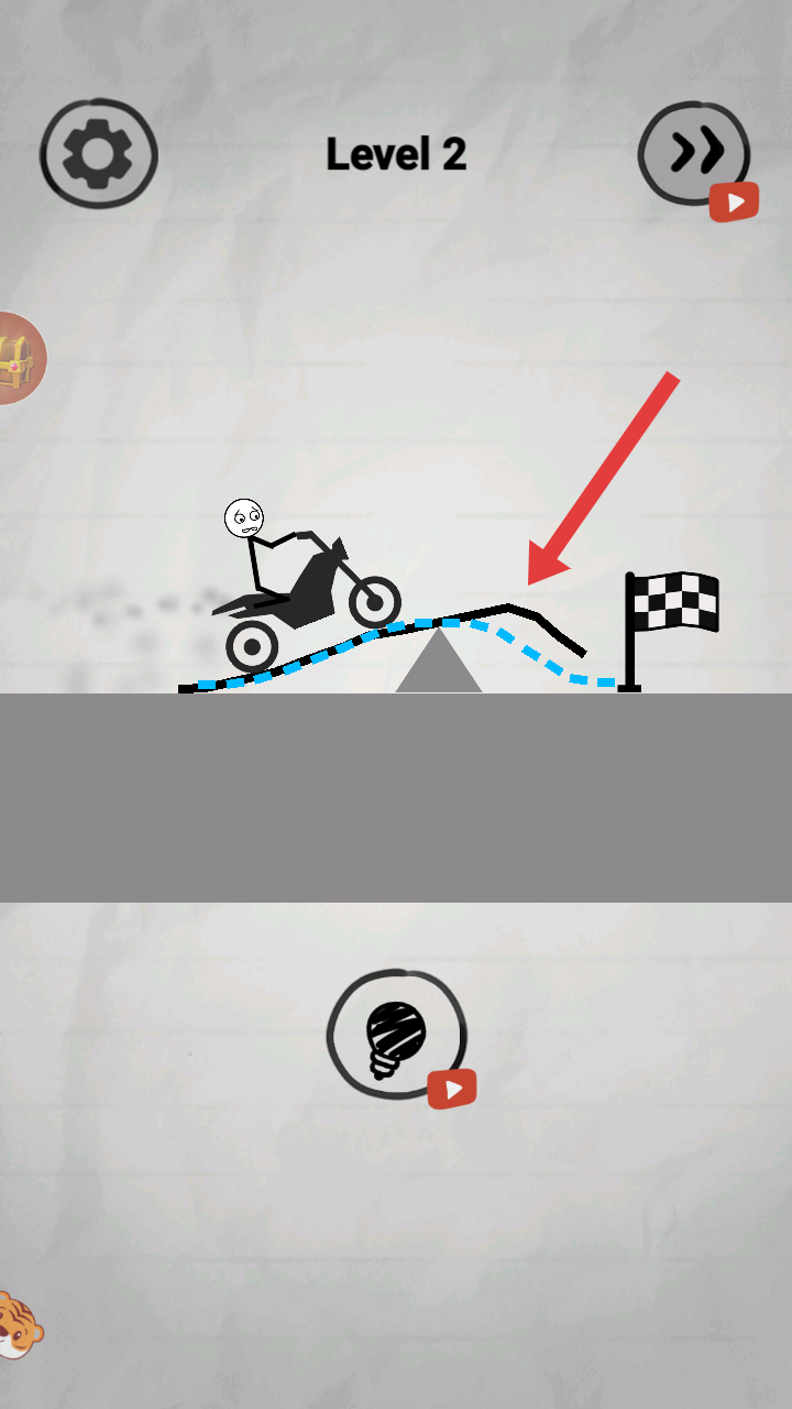3、進(jìn)入Level2,場(chǎng)景有山丘等障礙,需要更巧妙地畫(huà)出線條,讓摩托能越過(guò)障礙,朝著終點(diǎn)旗幟前進(jìn)。
