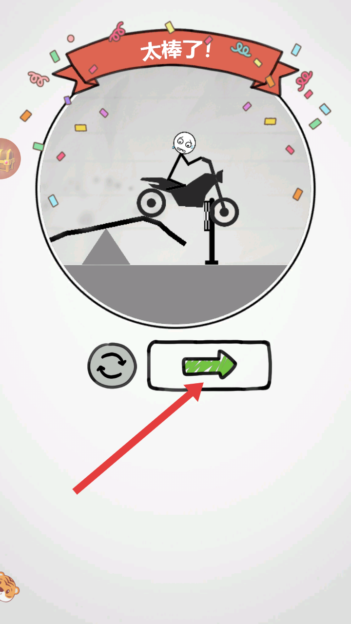 4、成功讓摩托到達(dá)終點(diǎn)后,顯示太棒了的慶祝界面,點(diǎn)擊綠色箭頭按鈕,繼續(xù)挑戰(zhàn)下一個(gè)關(guān)卡。