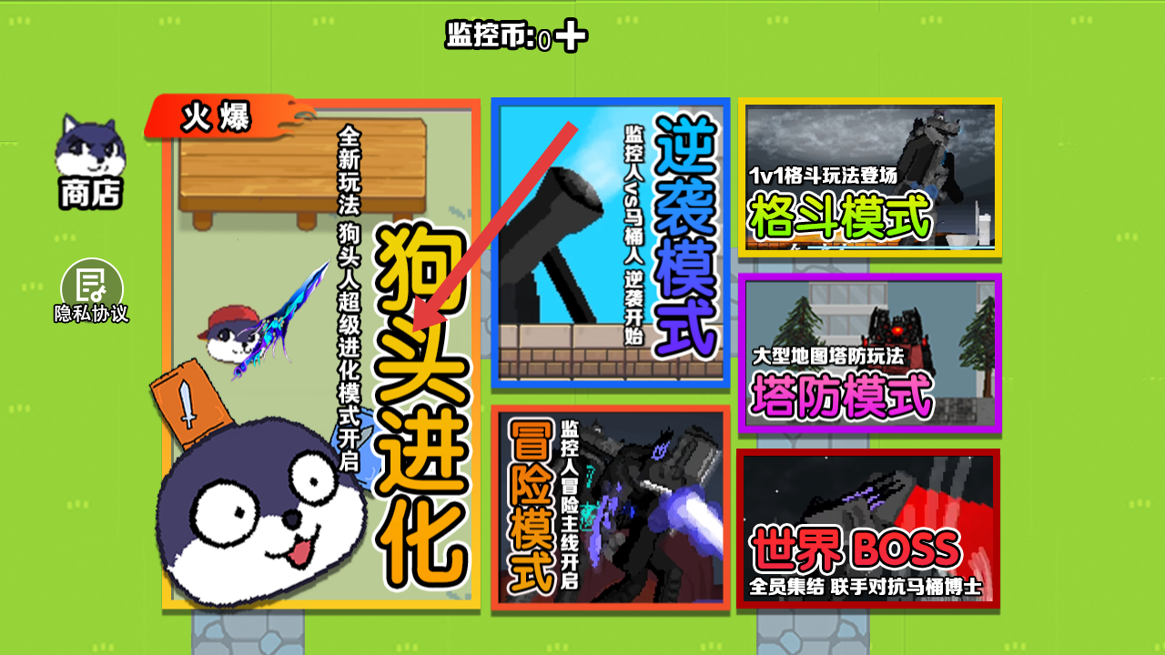 1、進(jìn)入游戲可看到多種模式選擇,像狗頭進(jìn)化、逆襲模式、格斗模式、塔防模式、冒險模式、世界BOSS等,能根據(jù)喜好挑選開啟不同玩法。