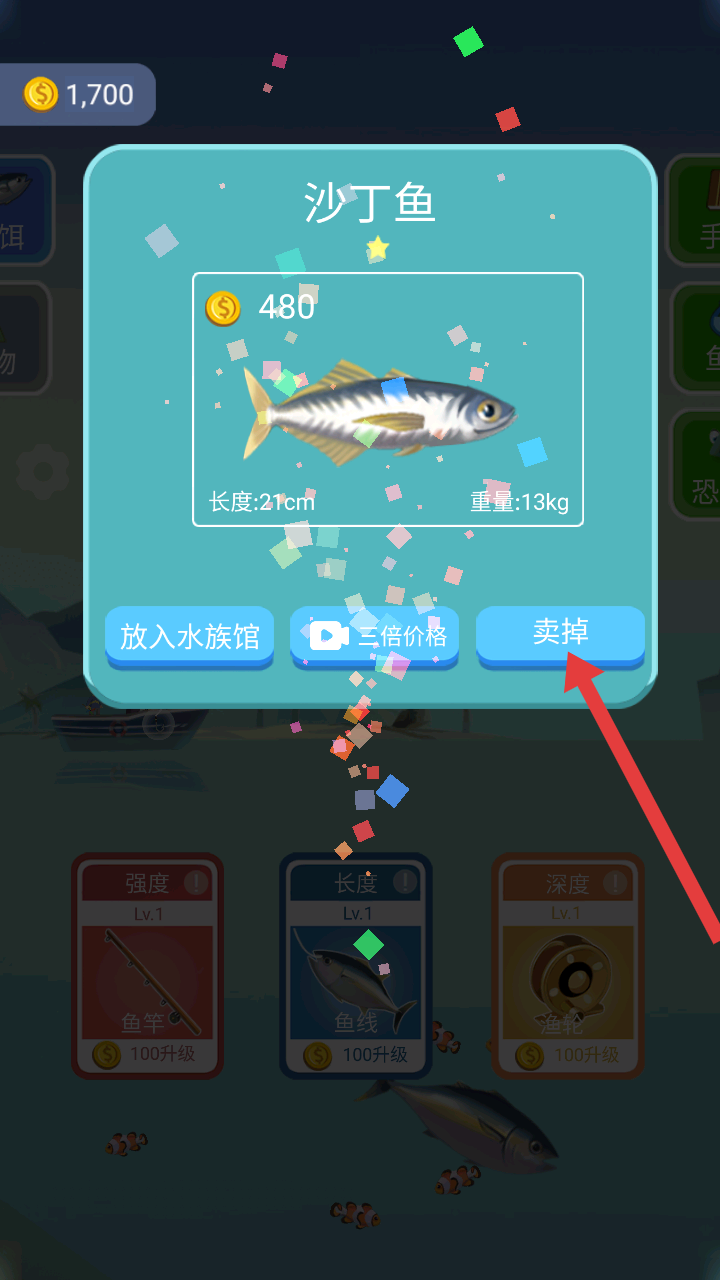 4、釣到魚后會顯示魚的信息,可選擇放入水族館或者賣掉,賣掉能獲得金幣,用于后續(xù)升級漁具等操作。