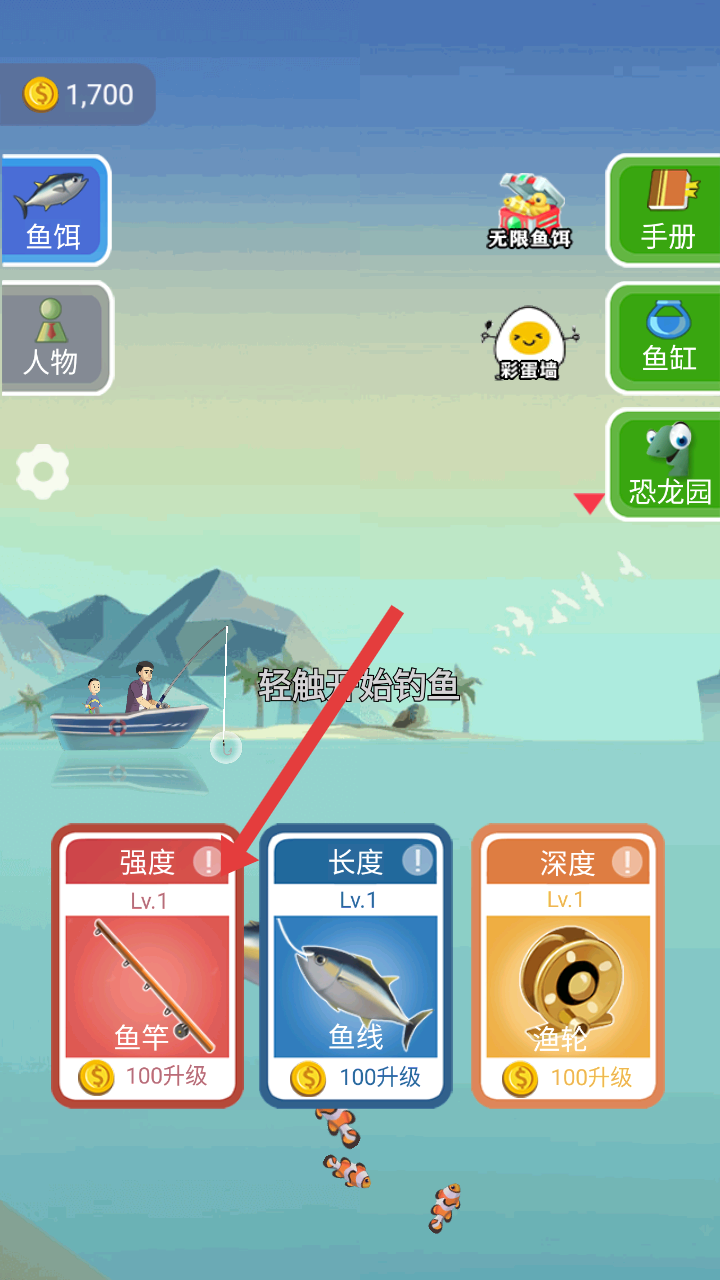 1、進入游戲,可看到魚竿、魚線、漁輪等漁具,能花費金幣升級它們,提升釣魚的相關(guān)屬性,為釣魚做好準備。