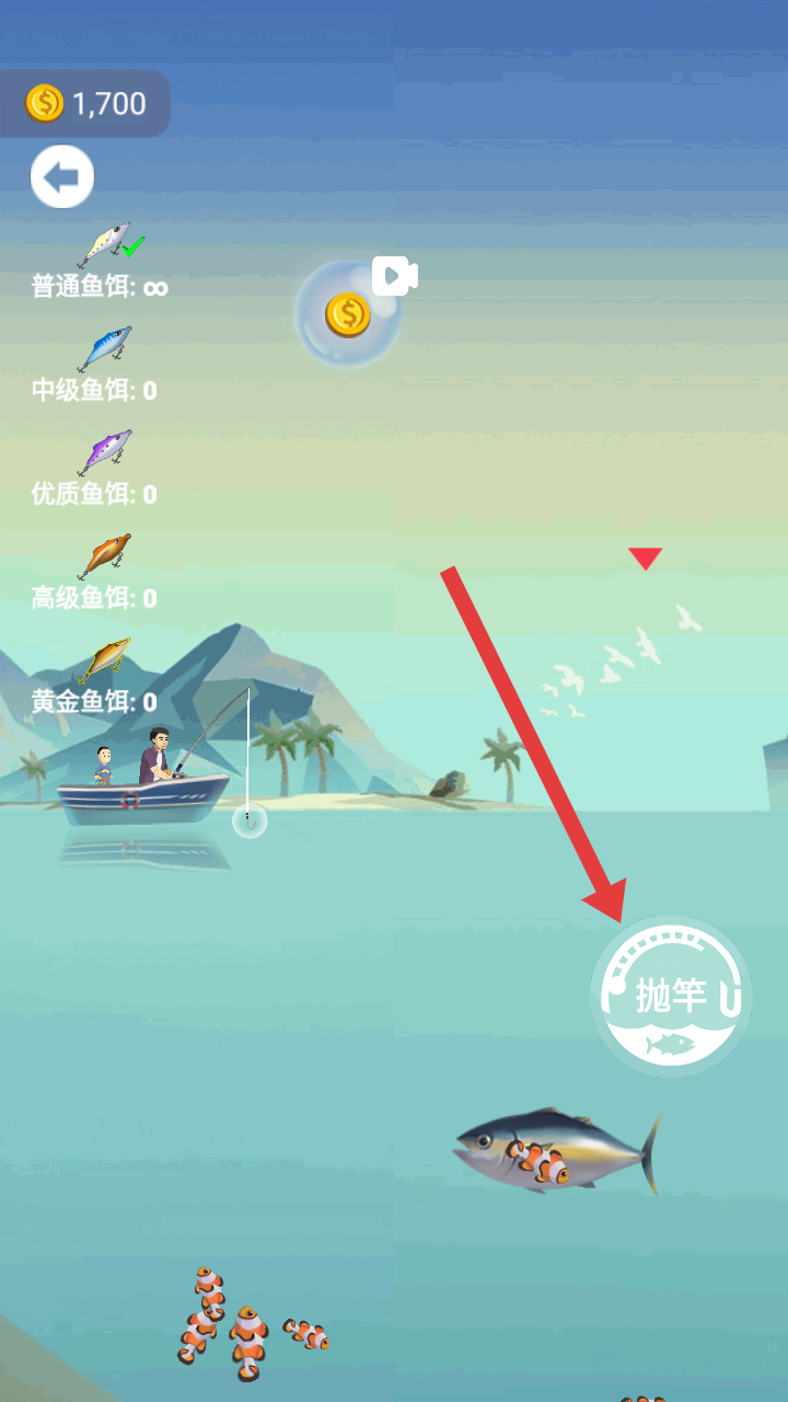 2、選擇魚餌有普通、中級等不同類型,選好后點擊拋竿,將魚鉤拋入水中,等待魚兒上鉤。