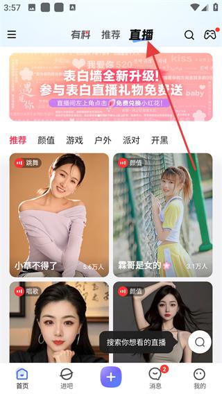 1、進(jìn)入主界面后,找到直播板塊,點(diǎn)擊直播,進(jìn)入直播列表頁面,瀏覽推薦的直播內(nèi)容。