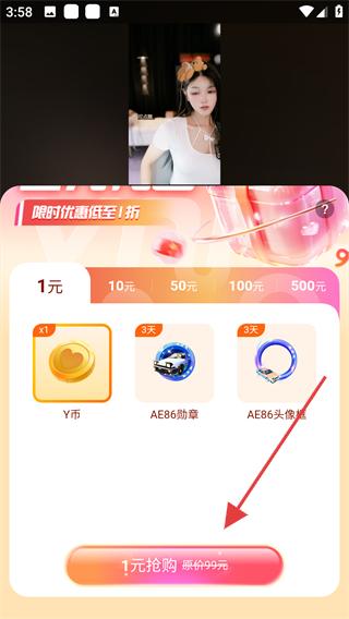 4、若想?yún)⑴c直播間優(yōu)惠活動,可找到限時優(yōu)惠活動入口,如1元搶購活動,點(diǎn)擊1元搶購按鈕,參與活動獲取福利。