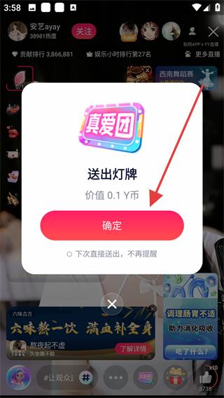 3、在直播間內(nèi)找到送禮按鈕,點(diǎn)擊送禮選擇要贈送的禮物,如燈牌,點(diǎn)擊確定按鈕。