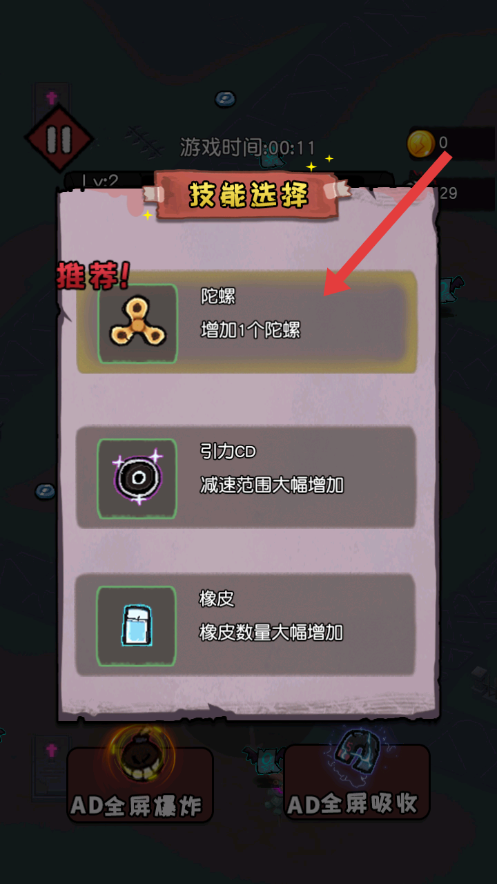 3、升級后會出現(xiàn)技能選擇界面,像推薦的陀螺技能,能增加陀螺數(shù)量,提升戰(zhàn)斗能力,助力更好戰(zhàn)斗。