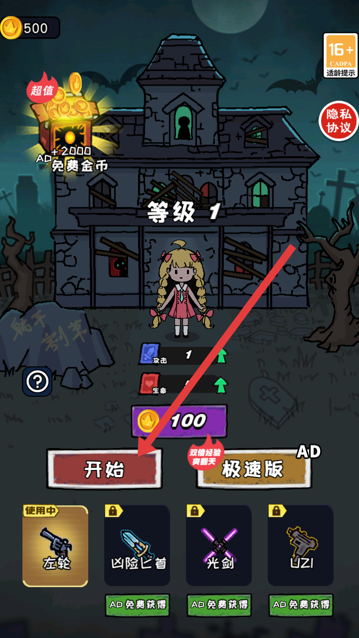 1、進入游戲,處于等級1的場景,點擊開始,開啟冒險戰(zhàn)斗,充滿怪物的區(qū)域,利用武器對抗敵人。
