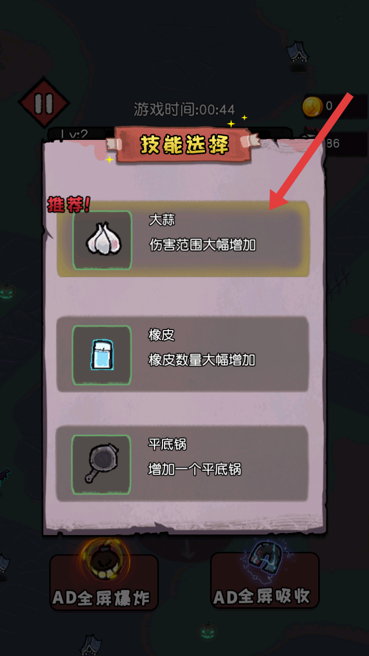 4、后續(xù)還有其他技能選擇,比如大蒜技能,可大幅增加傷害范圍,面對大量怪物時,能更高效地戰(zhàn)斗。