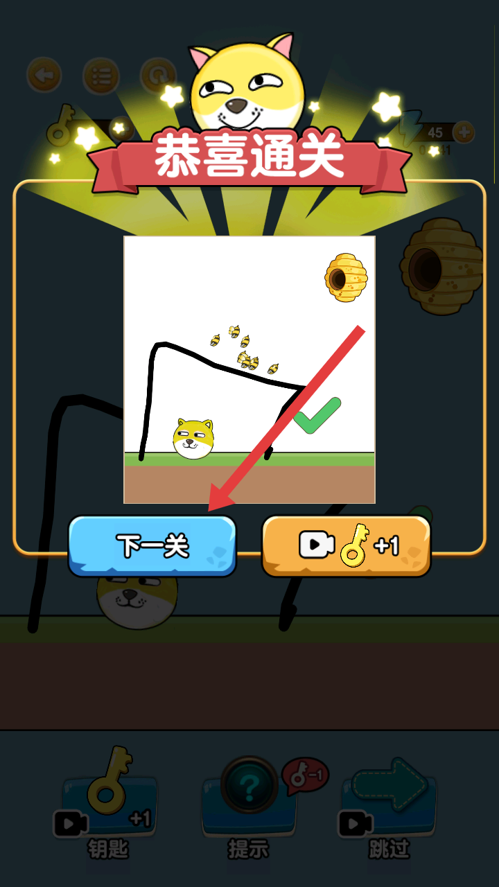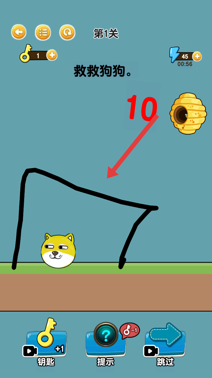 2、第1關(guān)需根據(jù)救救狗狗的提示,繪制線條搭建防護(hù),阻擋蜜蜂攻擊,同時(shí)可借助鑰匙、提示等道具。