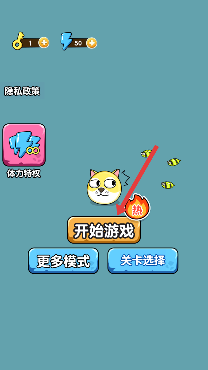 1、進(jìn)入游戲界面,能看到體力特權(quán)等功能按鈕,點(diǎn)擊開始游戲,即可開啟保護(hù)狗狗的冒險(xiǎn)挑戰(zhàn)。