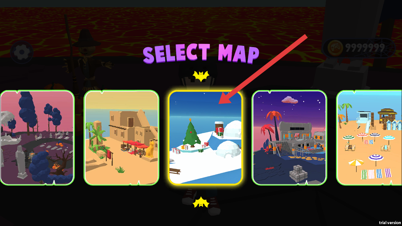 1、點擊START按鈕,進入地圖選擇界面,能挑選不同場景地圖,像有圣誕樹和冰屋的雪地地圖,選好后開啟游戲。