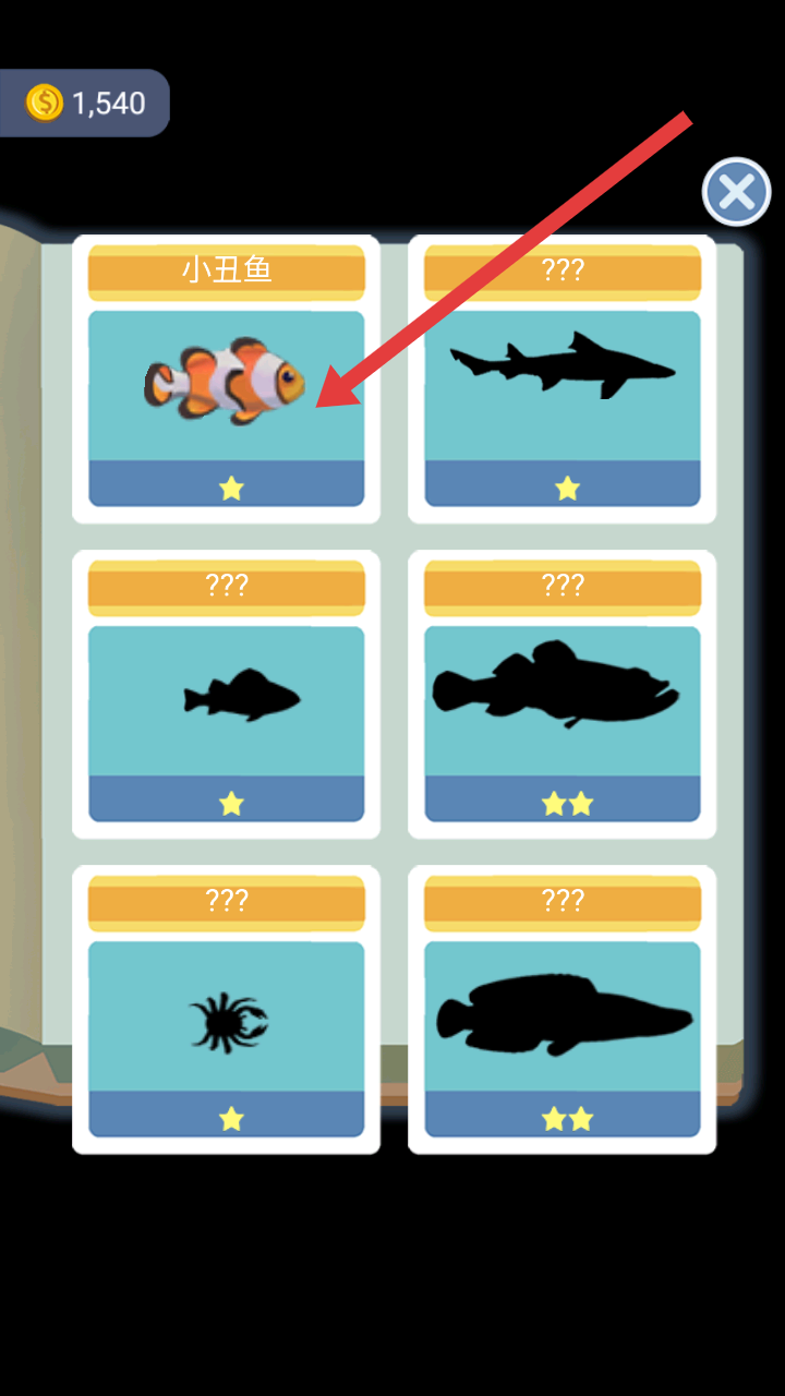 4、游戲有魚類圖鑒,能查看已釣到的魚,像小丑魚等,還有許多未知魚類等待解鎖,增加收集樂趣。
