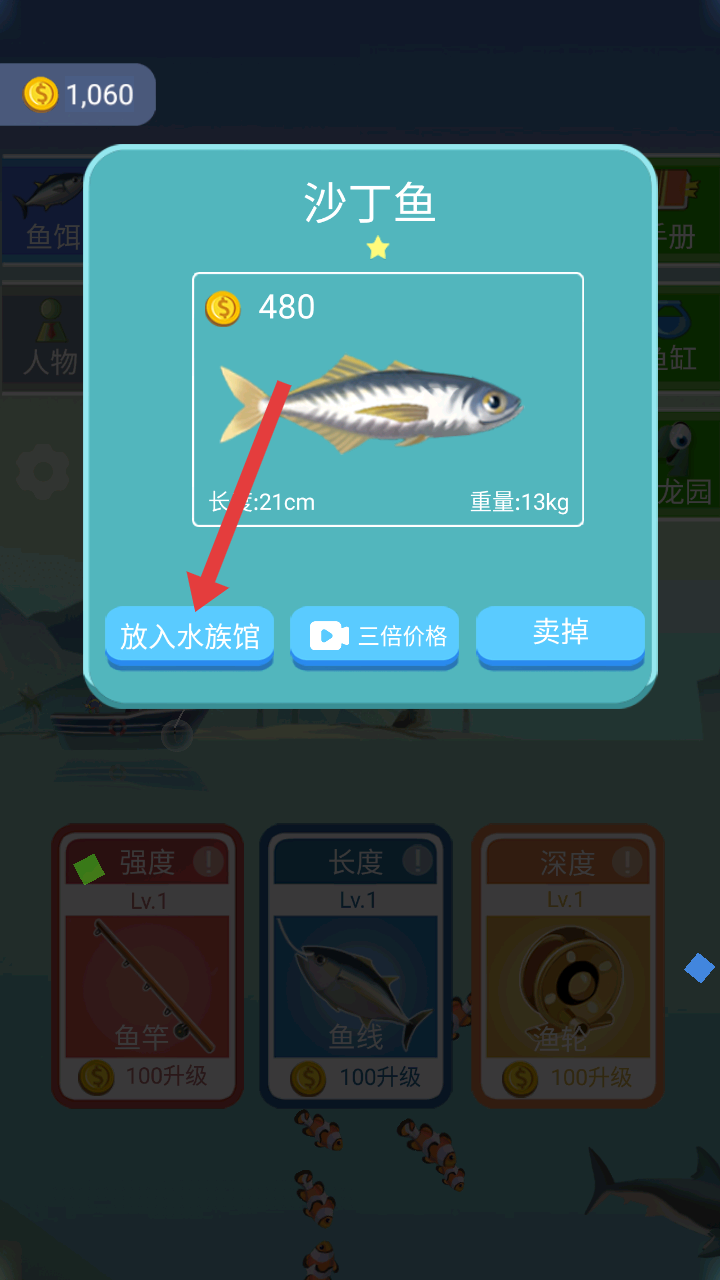3、釣到魚后,會顯示魚的信息,可選擇放入水族館展示,也能賣掉獲取金幣,還能看視頻以三倍價格出售。