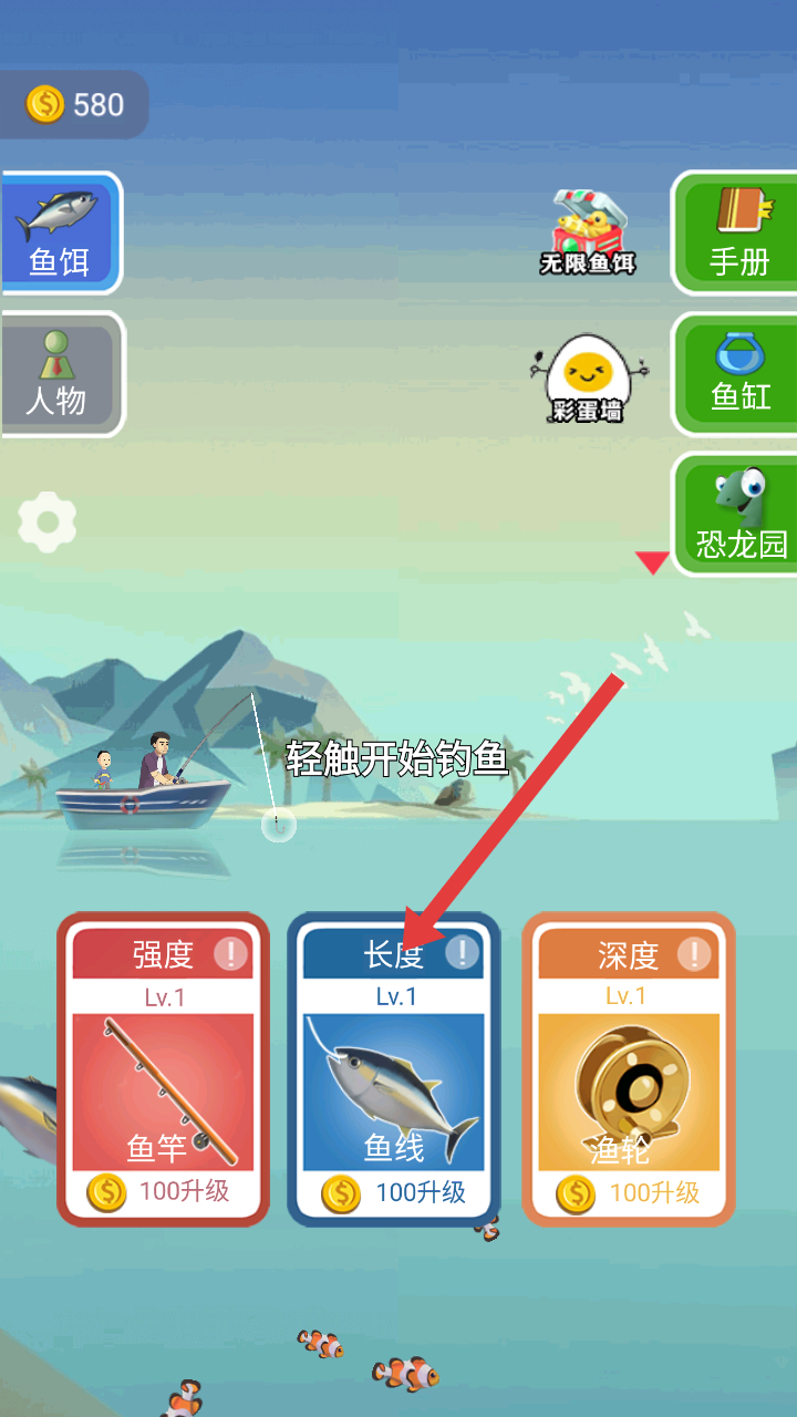 1、進入游戲界面,可看到魚餌、人物等功能選項,還有魚竿、魚線、漁輪可升級,輕觸就能開始釣魚。