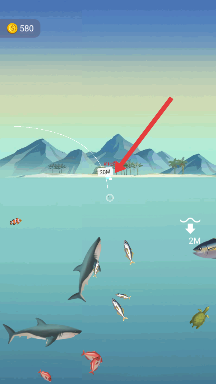 2、釣魚時,魚線會拋入水中,能看到不同種類的魚水中游動,等待魚上鉤。