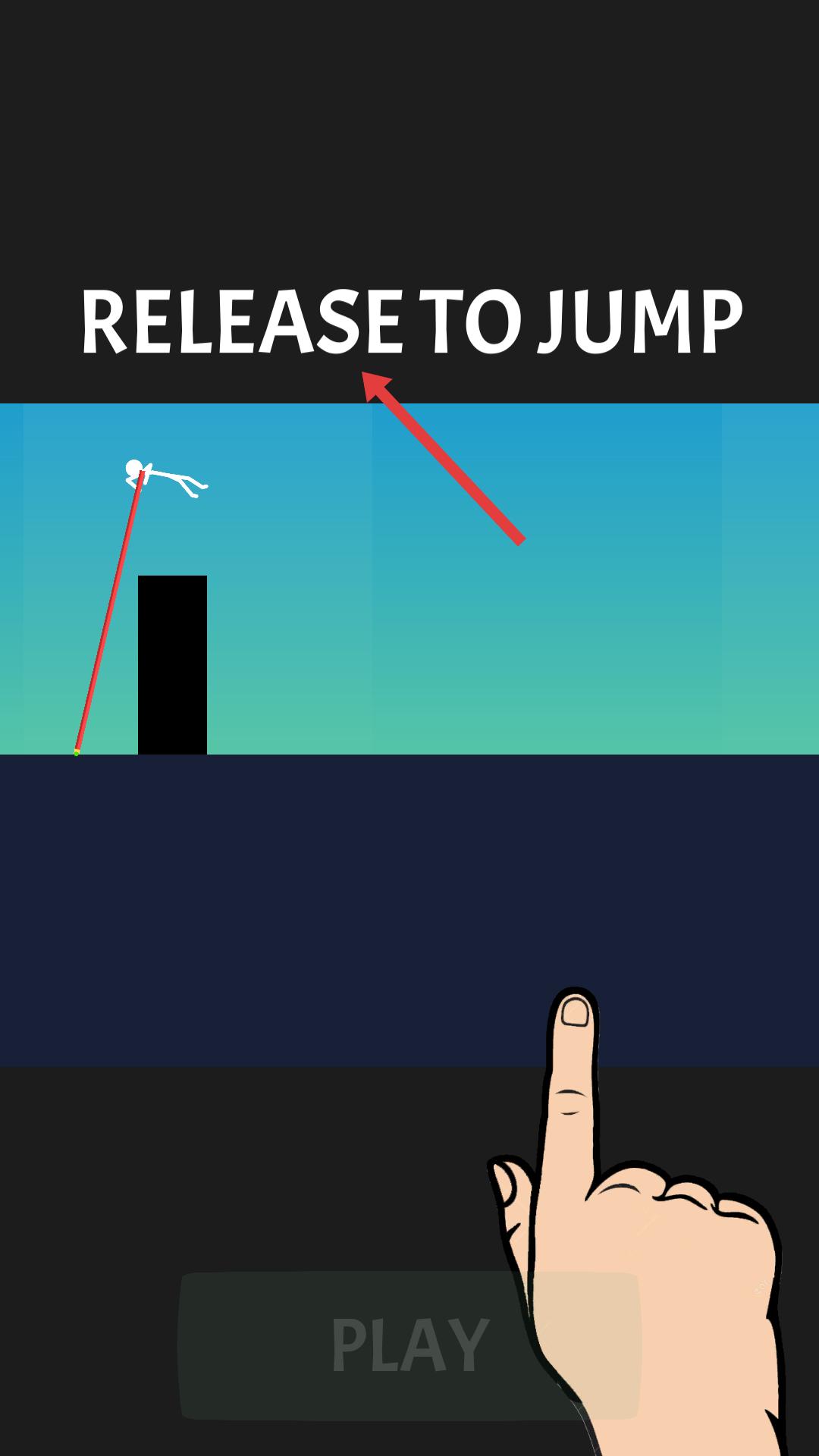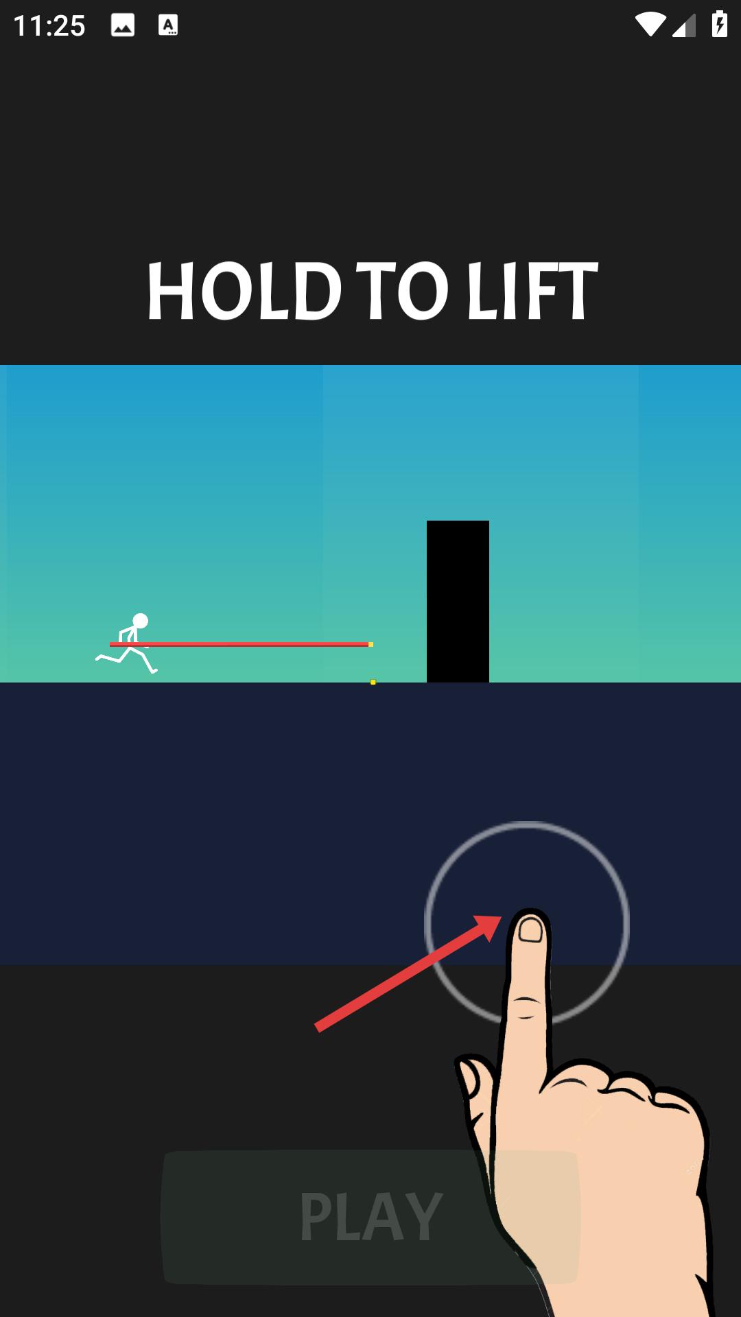 1、游戲開始時(shí)看到長(zhǎng)按左側(cè)提示,長(zhǎng)按屏幕讓角色舉起長(zhǎng)桿,為后續(xù)跳躍做準(zhǔn)備。
