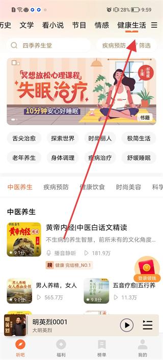 4、進(jìn)入健康生活板塊,可瀏覽疾病預(yù)防、健康飲食等分類的聽書內(nèi)容,如黃帝內(nèi)經(jīng)精讀、男人養(yǎng)精等,選擇感興趣的健康類聽書內(nèi)容收聽。