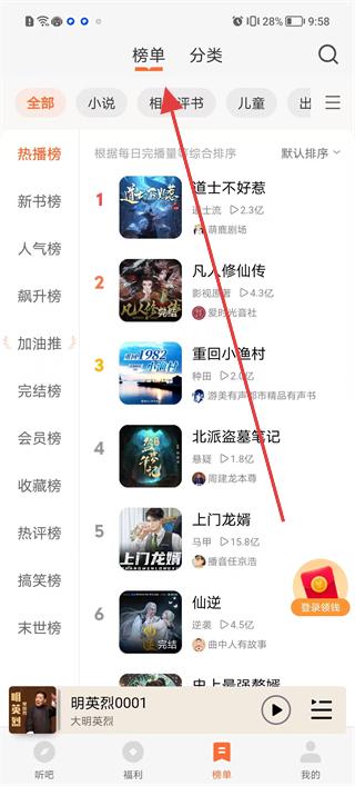 3、進(jìn)入榜單板塊可查看小說、相聲等分類榜單,如熱播榜的道士不好惹等,選擇心儀的聽書作品。