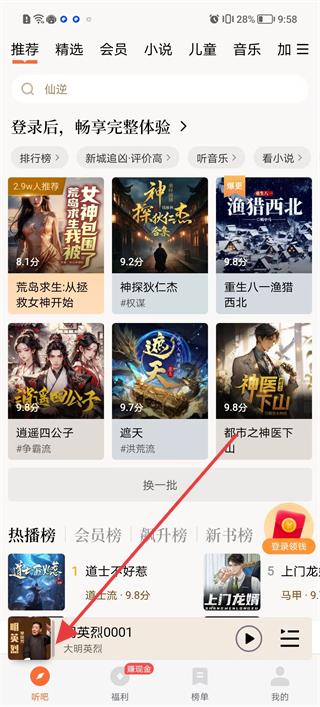 1、可瀏覽推薦的小說如荒島求生、神探狄仁杰等,也可查看熱播榜、會(huì)員榜等榜單,選擇感興趣的聽書內(nèi)容。