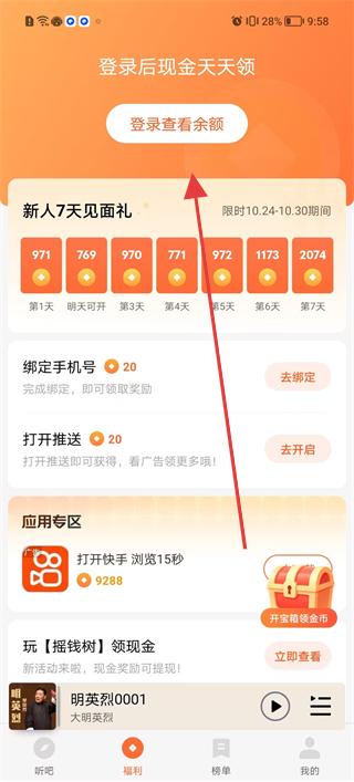 2、進(jìn)入福利板塊可登錄查看現(xiàn)金余額,參與新人7天見面禮活動(dòng),完成綁定手機(jī)號(hào)、打開推送等任務(wù),獲取獎(jiǎng)勵(lì)。