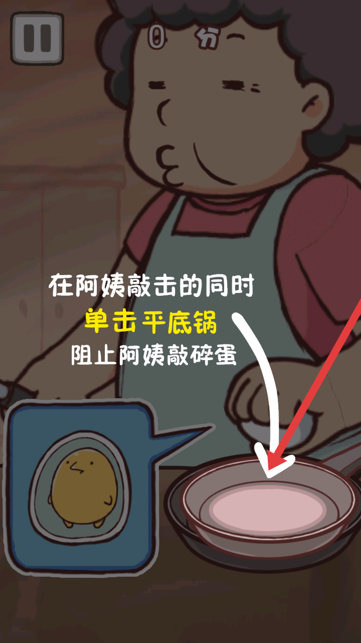3、游戲過程中當(dāng)阿姨敲擊時,要同時單擊平底鍋,阻止阿姨敲碎雞蛋,以此獲取分?jǐn)?shù)。
