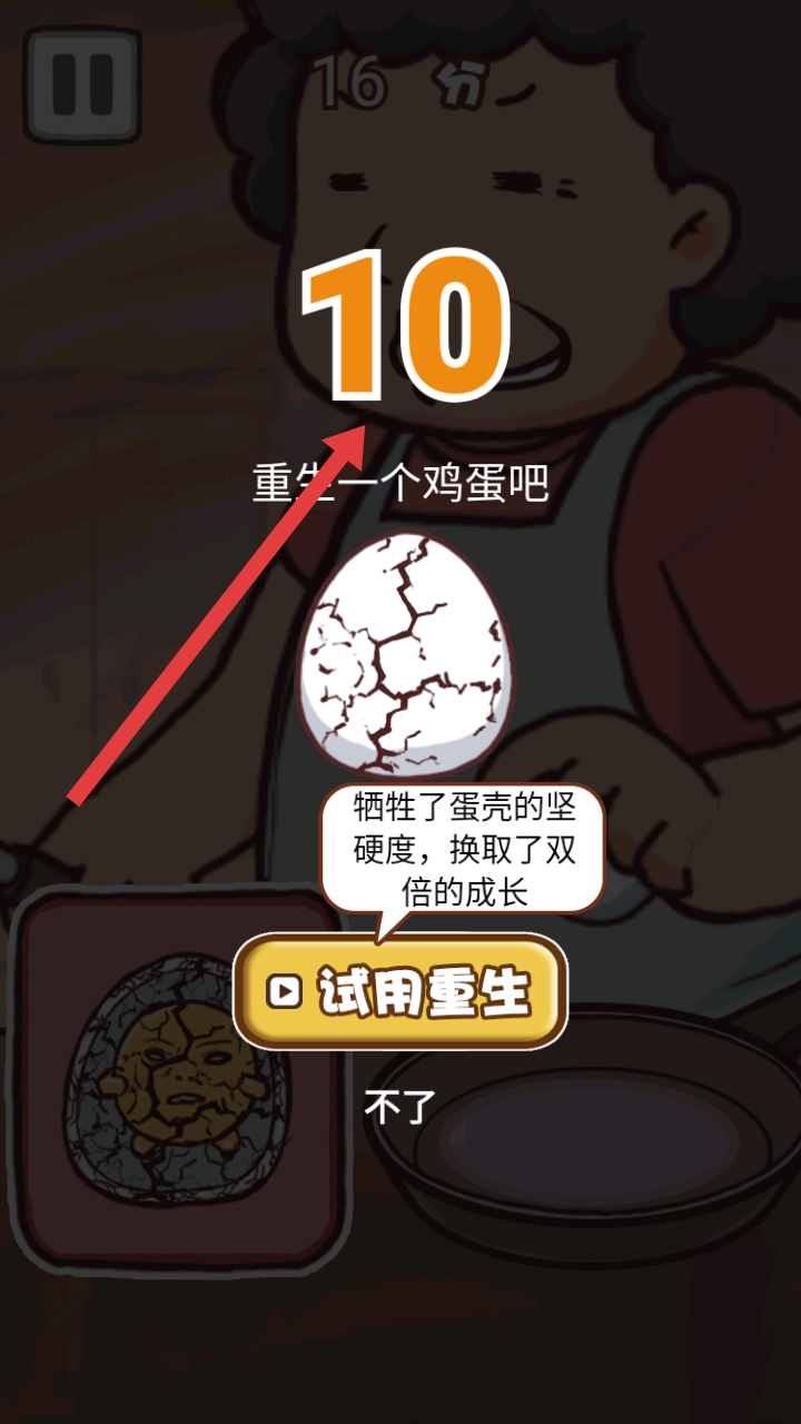 4、若雞蛋快被敲碎,可選擇試用重生,犧牲蛋殼硬度來換取雙倍成長,獲得更高分?jǐn)?shù),繼續(xù)游戲挑戰(zhàn)。