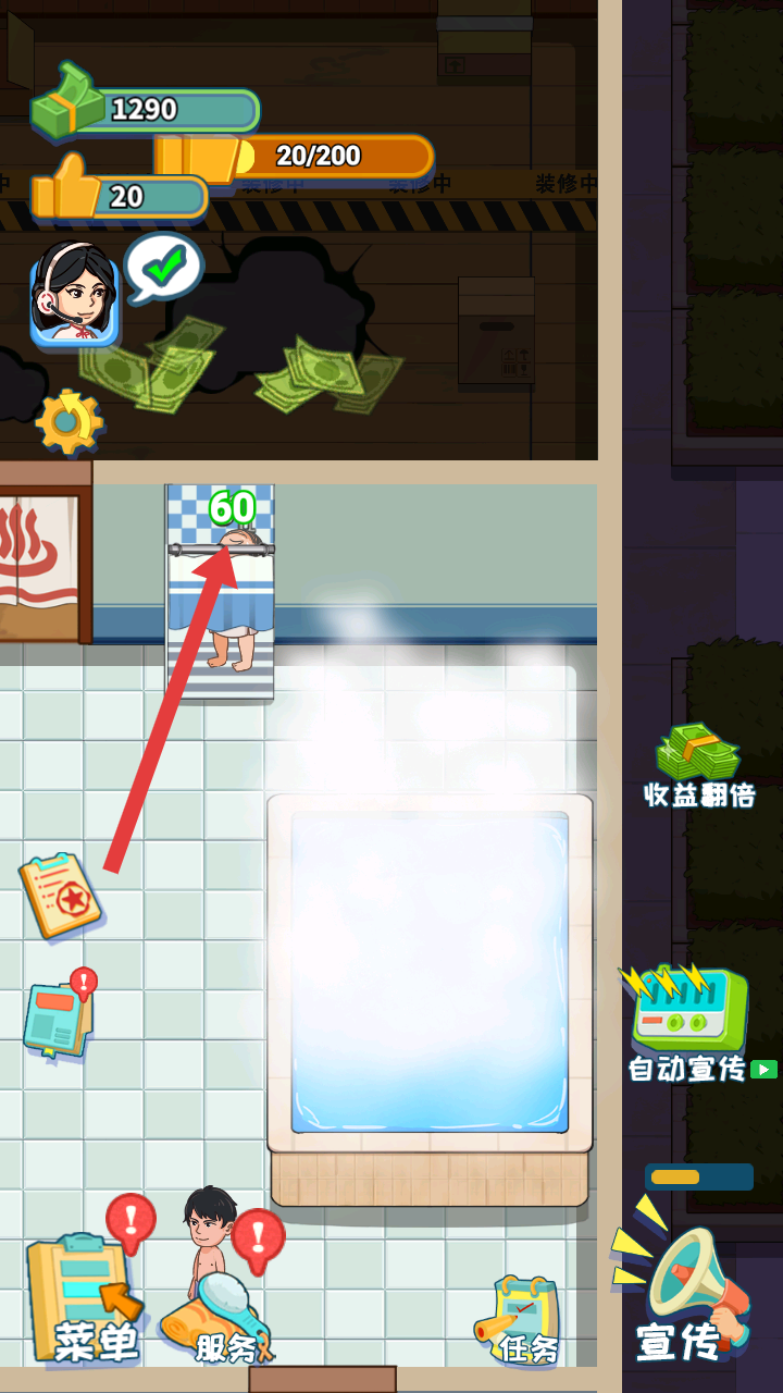 1、進入洗浴中心經(jīng)營游戲,可看到有資金、好評等數(shù)據(jù),還有正在裝修的區(qū)域,賺取客人的好評可以開發(fā)新區(qū)域。