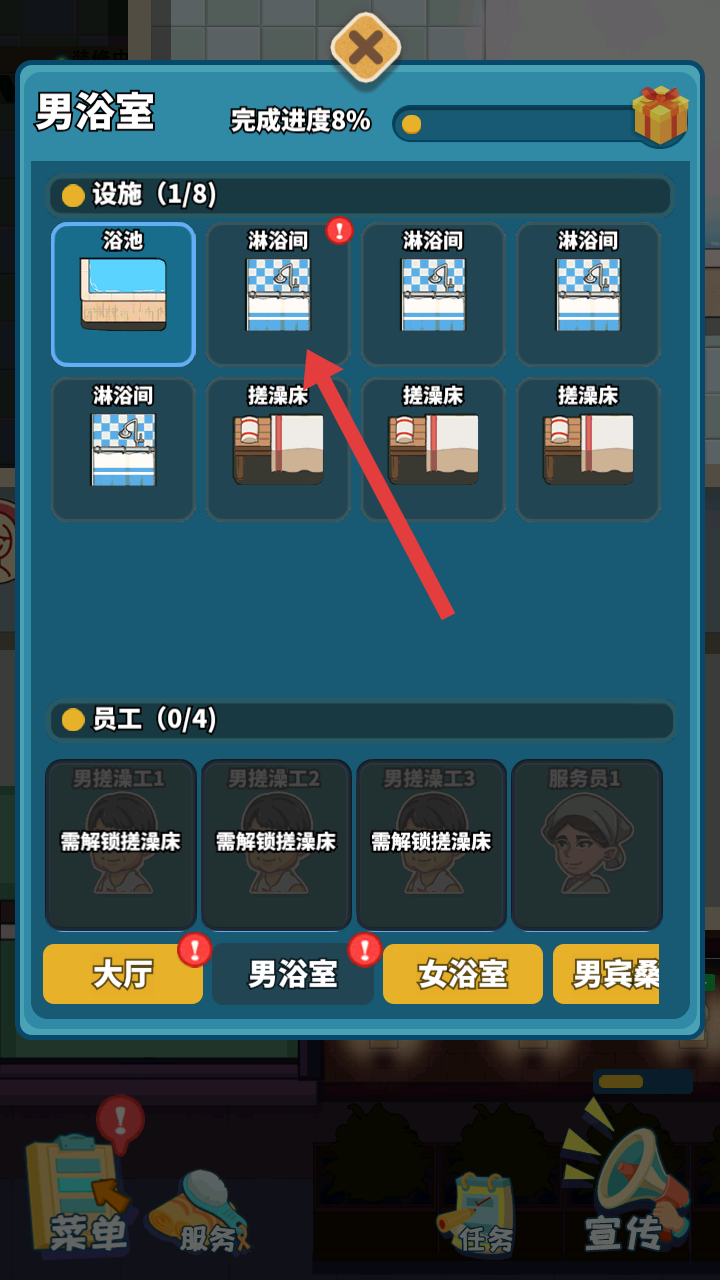 2、男浴室界面有浴池、淋浴間、搓澡床等設施,以及男搓澡工、服務員等員工,可逐步解鎖設施和員工,提升洗浴中心服務能力。