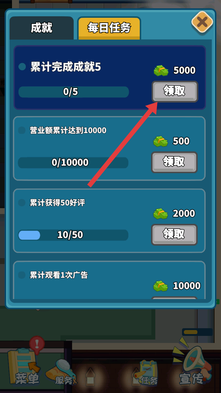 3、每日任務界面里,有累計完成成就、營業(yè)額累計達到一定數(shù)值等任務,完成任務后點擊領取,能獲得資金等獎勵,助力洗浴中心發(fā)展。