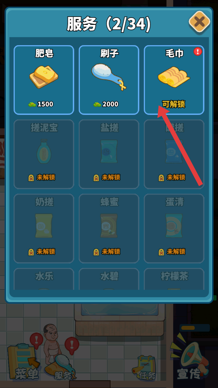 4、服務界面中,有肥皂、刷子、毛巾等服務項目,可花費資金解鎖,豐富洗浴中心的服務種類,滿足顧客更多需求。