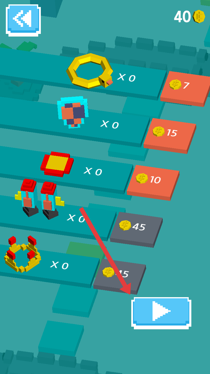 4、還有包含不同道具和金幣獎勵的界面,可選擇道具,點擊開始類按鈕繼續(xù)冒險,體驗像素世界的移動與挑戰(zhàn)樂趣。