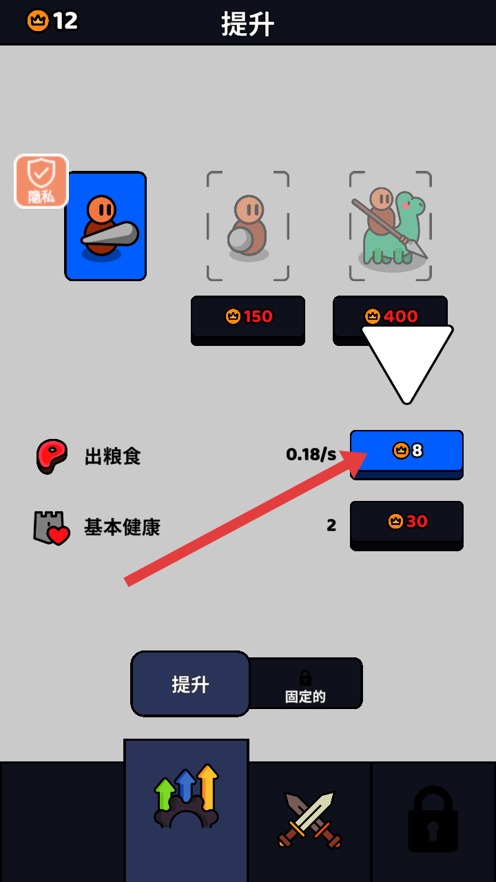 4、提升界面,能花費金子提升不同兵種,像普通小兵、持盾小兵、騎乘兵種等,也可提升出糧食速度、基本健康等屬性,增強戰(zhàn)力,為后續(xù)戰(zhàn)斗做準備。