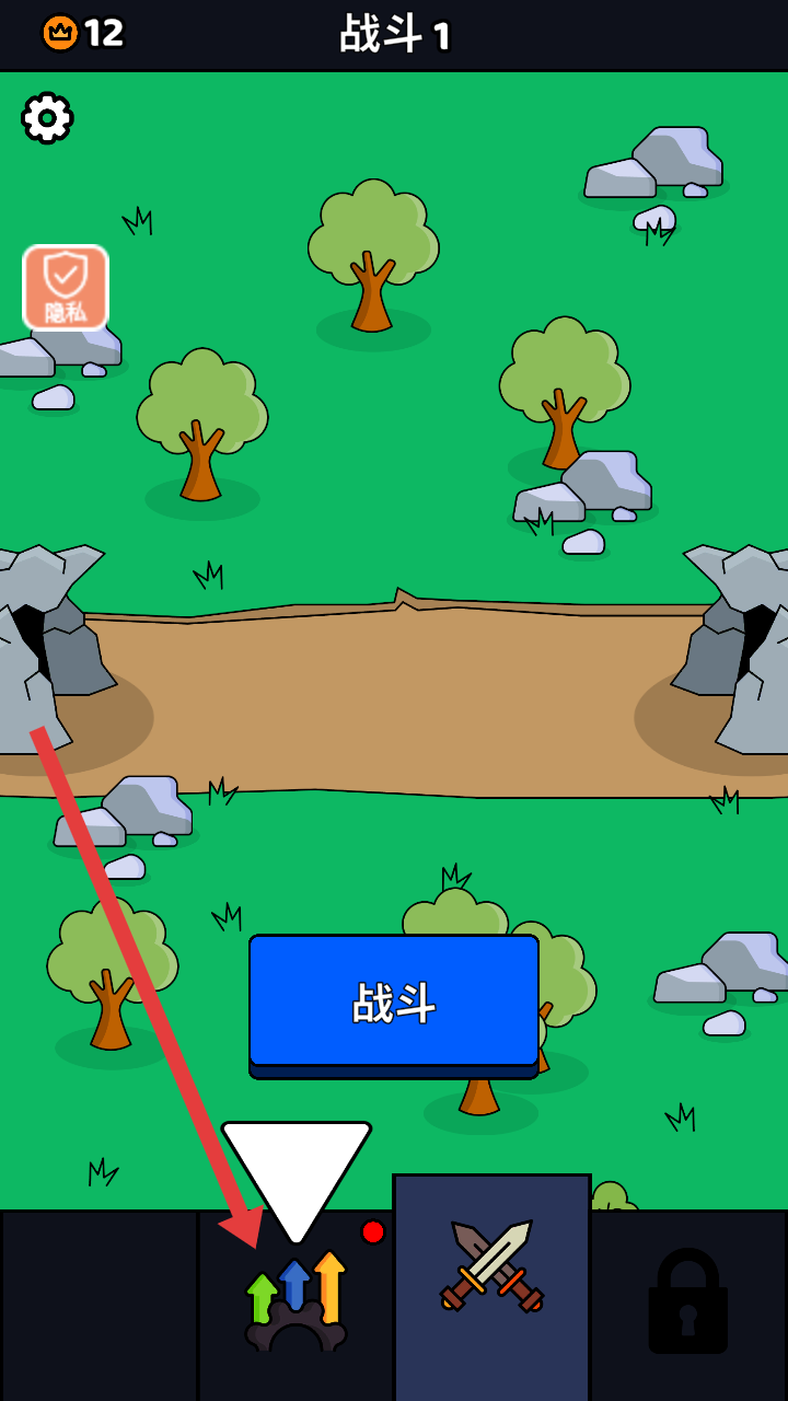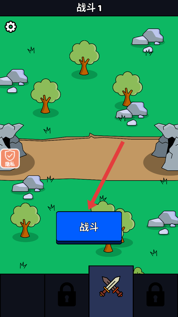 1、進入游戲,戰(zhàn)斗1場景中點擊戰(zhàn)斗按鈕開啟戰(zhàn)斗,打敗敵人獲得勝利拿取金幣。