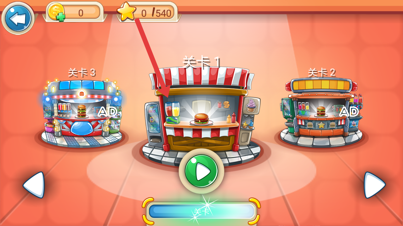 1、進入游戲,有關(guān)卡1,關(guān)卡2,關(guān)卡3,等不同關(guān)卡的餐廳可選擇,點擊對應(yīng)綠色開始按鈕進入關(guān)卡。