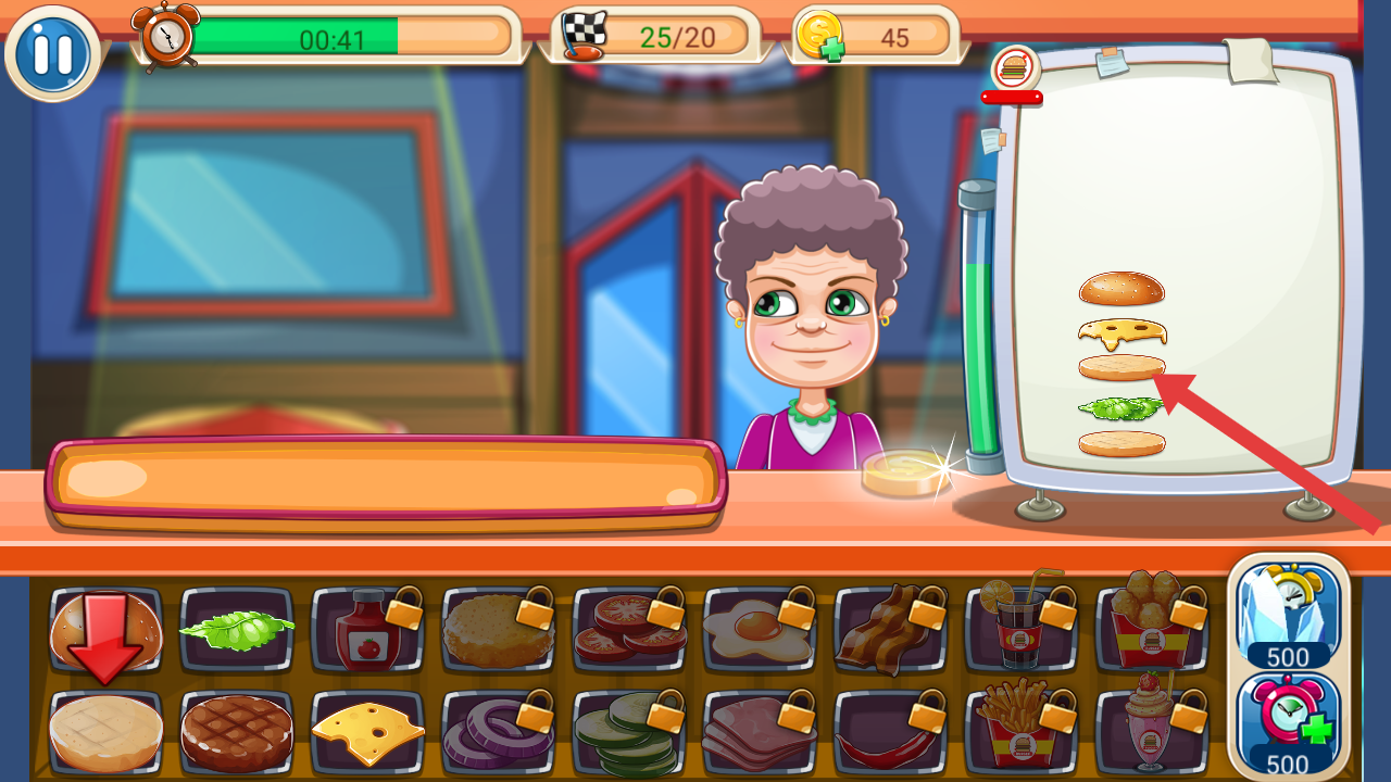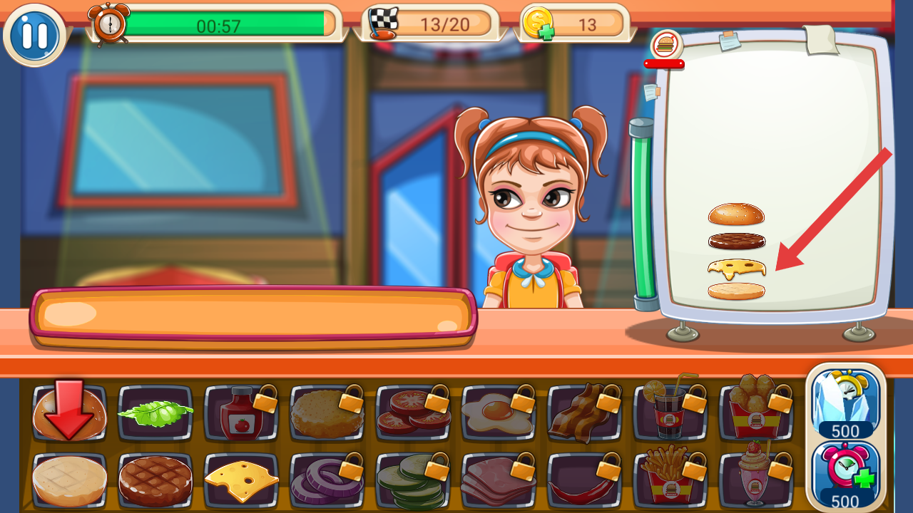 2、關(guān)卡內(nèi)根據(jù)顧客訂單需求,從下方食材欄中選取相應(yīng)食材,如制作漢堡需要的面包、肉餅、芝士等,組合成符合訂單的食物。